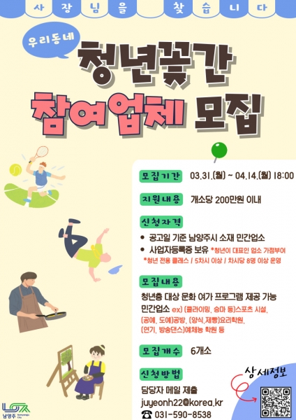 [금요저널] 남양주시는 ‘우리동네 청년꽃간’ 사업에 참여할 민간 업체를 오는 4월 14일까지 모집한다.
