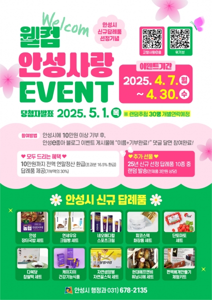 시 관계자는 “이번 이벤트를 통해 안성시를 사랑하는 기부자들과 신규 답례품 공급업체 모두에게 실질적인 혜택을 제공할 수 있어 뜻깊다”며 “앞으로도 안성시 고향사랑기부 활성화를 위한 다양한 방안을 마련해 나가겠다”고 말했다.