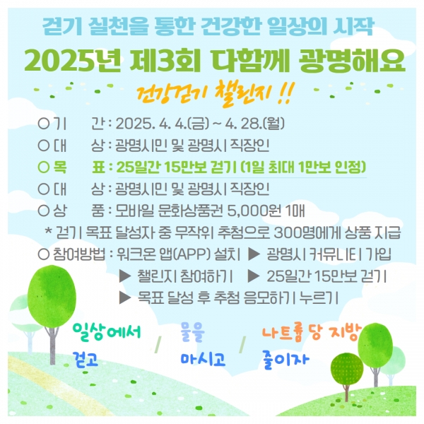 시는 오는 28일까지 시민의 건강한 생활습관 형성과 만성질환 예방을 위해 ‘2025년 제3회 다함께 광명해요’ 건강 걷기 챌린지를 운영한다.