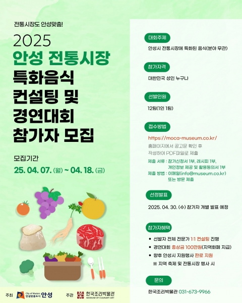 [금요저널] 안성시는 4월 7일부터 18일까지 ‘전통시장 특화음식 컨설팅 및 요리경연대회’ 참가자를 모집한다고 밝혔다.