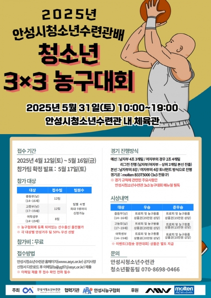 [금요저널] 안성시청소년수련관은 청소년들의 패기와 뜨거운 열정을 불태울 ‘2025년 안성시청소년수련관배 청소년 3×3 농구대회’를 오는 5월 31일 안성시청소년수련관에서 개최한다고 밝혔다.