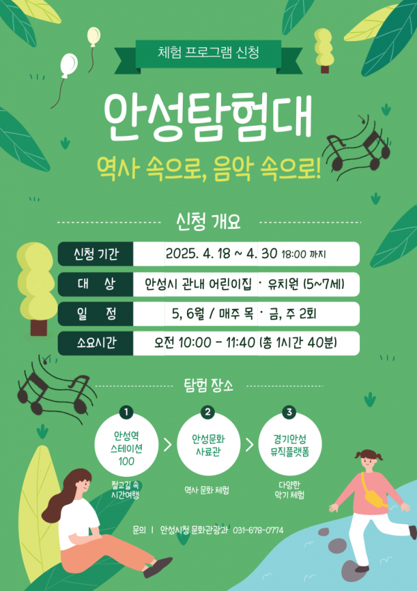 [금요저널] 안성시는 4월 18일부터 30일까지 관내 어린이집 및 유치원 유아를 대상으로 지역 문화시설을 연계한 체험형 프로그램 ‘안성 탐험대: 역사 속으로 음악 속으로’ 신청자를 모집하며 지역 문화시설 활성화에 나선다.