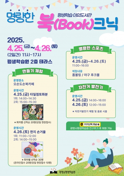 [금요저널] 광명시 평생학습원은 오는 25일부터 26일까지 이틀간 평생학습원 2층 테라스와 오손도손 북카페 등에서 2025년 상반기 평생학습 야외도서관 ‘명랑한 북크닉’을 운영한다.