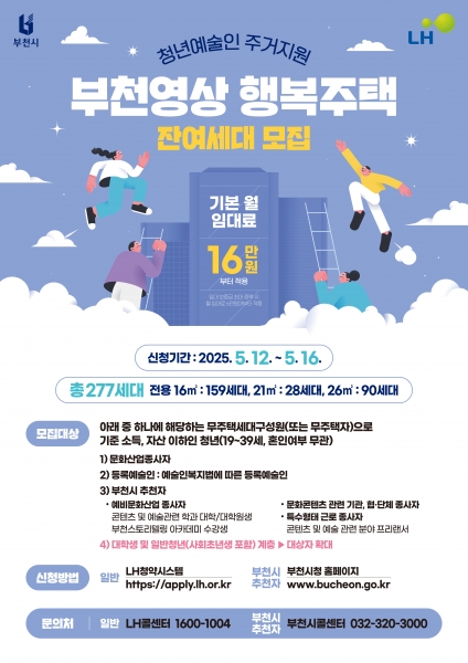 [금요저널] 부천시는 청년 예술인들의 주거 안정을 지원하기 위해 ‘청년예술인주택’ 4차 입주자를 모집한다고 28일 밝혔다.