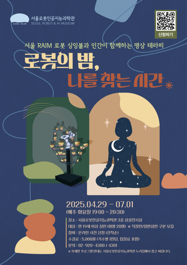 서울시립과학관의 분관인 서울로봇인공지능과학관은 오는 7월 1일까지 매주 화요일 저녁마다 서울로봇인공지능과학관 3층 상설전시실에서 명상 테라피 프로그램 ‘로봇의 밤, 나를 찾는 시간’을 운영한다고 밝혔다.