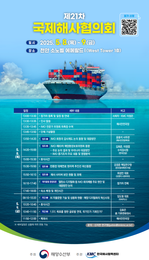 [금요저널] 해양수산부는 5월 8일~9일 이틀간 천안에서 ‘제21차 국제해사협의회’를 개최한다고 밝혔다.