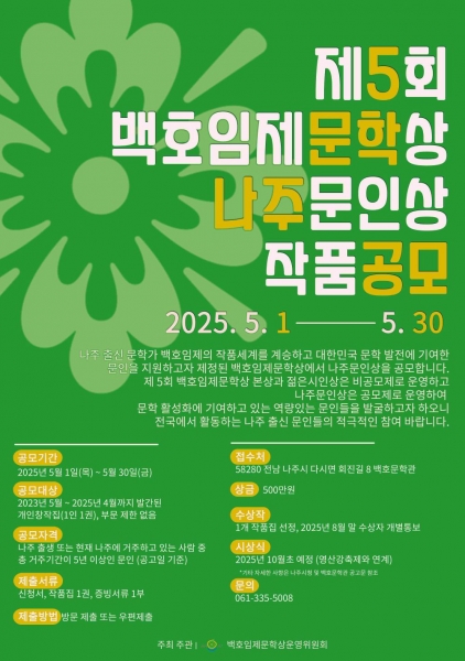 [금요저널] 전라남도 나주시는 제5회 백호임제문학상 나주문인상을 공모한다고 12일 밝혔다.