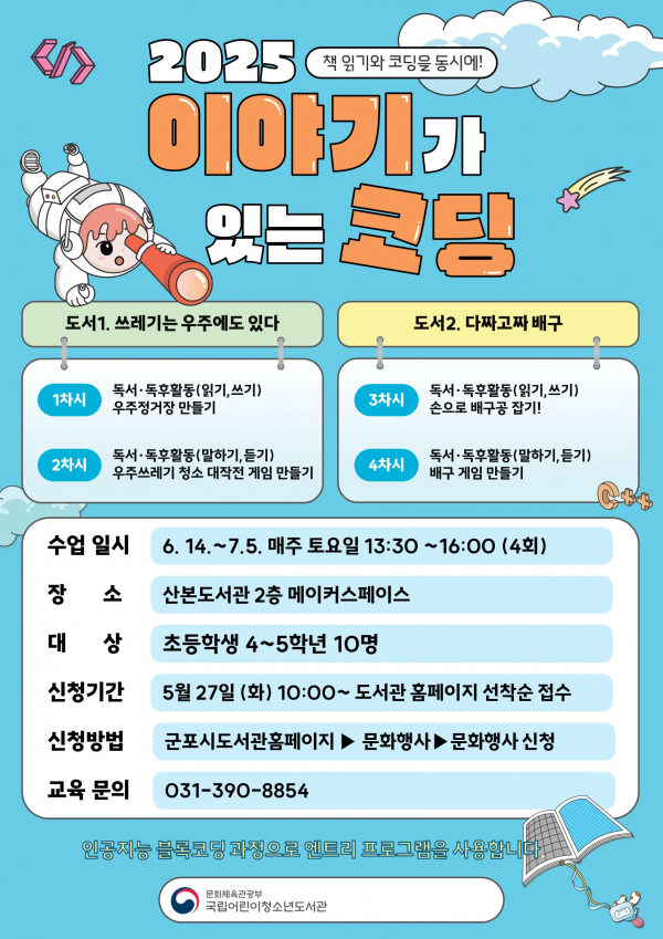 [금요저널] 군포시산본도서관은 국립어린이청소년도서관이 주관하는 ‘2025년 이야기가 있는 코딩’ 공모사업에 선정되어 그림책과 소프트웨어를 연계한 융합형 코딩교육 프로그램을 오는 6월 14일부터 운영한다.