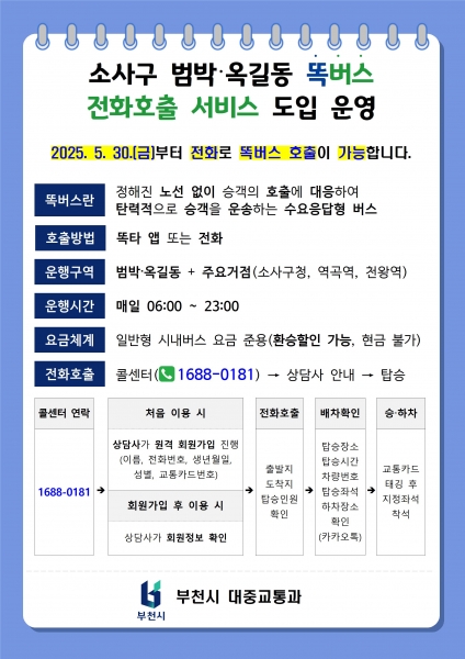 [금요저널] 부천시는 5월 30일부터 소사구 범박동과 옥길동을 운행 중인 ‘똑버스’에 전화 호출 서비스를 도입한다고 27일 밝혔다.