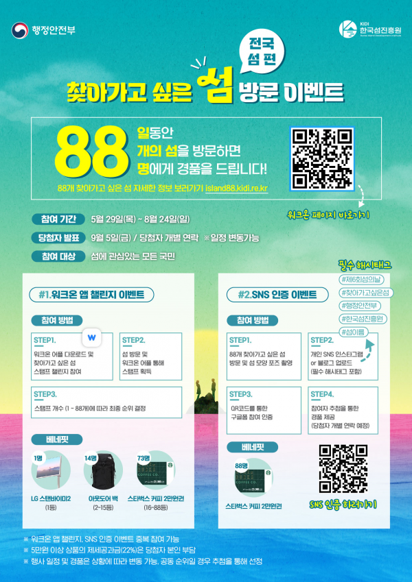 행정안전부는 ‘찾아가고 싶은 섬’ 으로 선정된 88개 섬에 대한 국민의 관심을 높이고 방문을 활성화 하기 위해 5월 29일부터 8월 24일까지 88일간 방문 인증 이벤트도 진행한다.