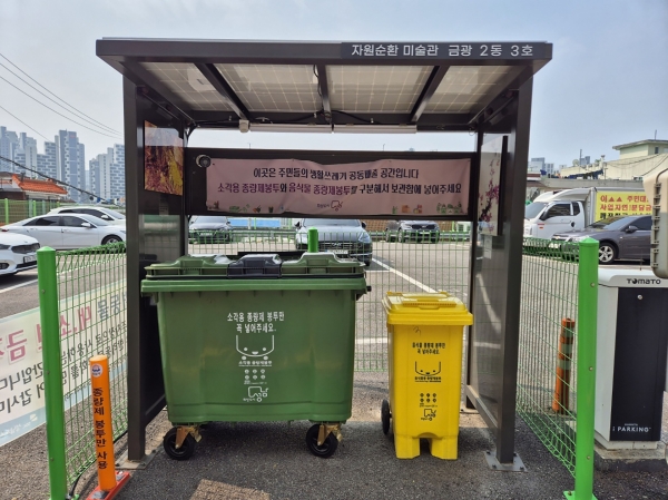 자원순환 미술관은 태양광 패널 지붕이 달린 철제 구조물을 설치해 양쪽 벽면에 그림을 걸어 전시하고 구조물 안에 소각용 쓰레기 종량제 봉투 보관함과 음식물 쓰레기용 종량제 봉투 보관함을 비치하는 방식이다.