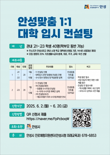 시 관계자는 “이번 컨설팅이 우리 지역 학생들의 입시 준비와 대학 선택에 실질적인 도움을 주어 미래의 꿈을 이루는 데 중요한 발판이 되기를 바란다”며 “앞으로도 체계적이고 전문적인 컨설팅을 통해 안성시 학생들의 대학 진학률을 높이고 불필요한 사교육비 부담을 줄일 수 있는 다양한 진로·진학 프로그램 운영에 최선을 다하겠다”고 밝혔다.