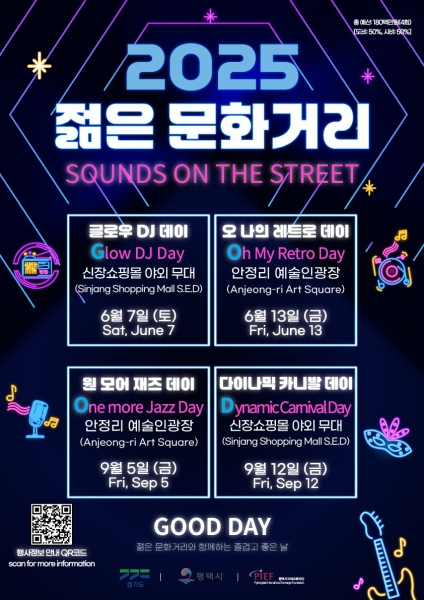 평택시와 평택시 국제교류재단은 오는 6월과 9월, 미군부대 앞 신장동과 안정리 일원에서 ‘2025 젊은 문화거리 조성 – Sounds on the Street’을 총 4회에 걸쳐 운영한다고 밝혔다.
