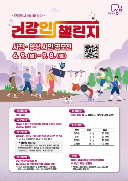 [금요저널] 성남시는 6월 9일부터 9월 8일까지 ‘건강도시 성남을 담다’를 주제로 ‘건강 인 챌린지 사진·영상 시민 공모전 ‘을 개최한다.