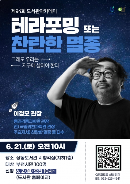 [금요저널] 부천시 상동도서관은 6월 21일 오전 10시부터 12시까지 ‘찬란한 멸종’의 저자이자 전 국립과천과학관장인 이정모 관장을 초청해 ‘제94회 도서관 아카데미’를 개최한다.