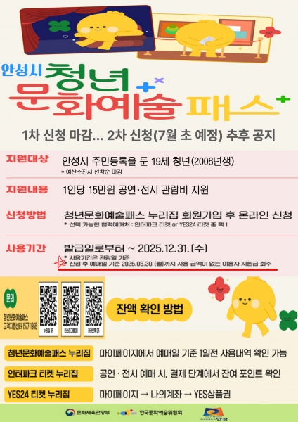 2차 신청기간은 청년문화예술패스 누리집 및 안성시 SNS 채널 등을 통해 추후 공지 예정이다.