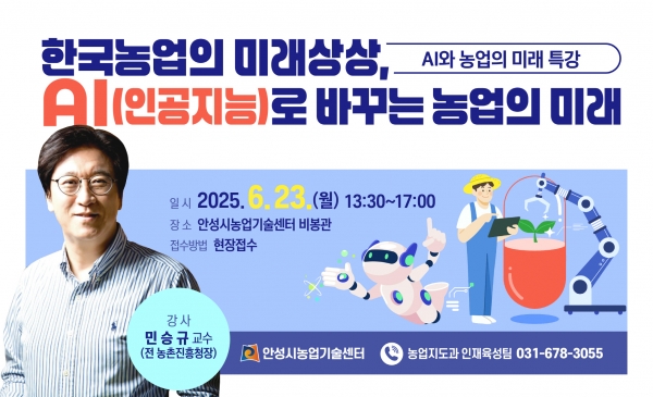 [금요저널] 안성시농업기술센터는 오는 6월 23일 오후 1시 30분부터 5시까지 ‘AI가 바꾸는 농업의 미래’를 주제로 한 특강을 안성시농업기술센터 비봉관에서 진행한다고 밝혔다.