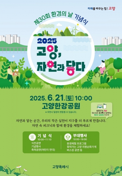 [금요저널] 고양특례시는 오는 21일 오전 10시부터 오후 4시까지 고양한강공원 잔디광장에서 환경의 날 기념행사 ‘고양, 자연과 닿다’를 개최한다고 밝혔다.