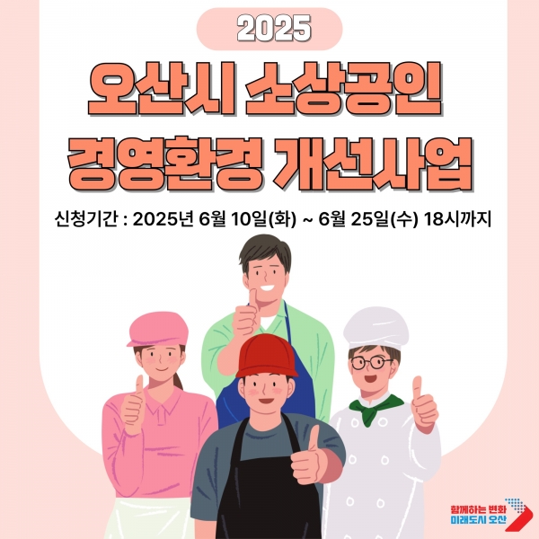 [금요저널] 오산시는 관내 소상공인의 안정적인 경영 기반 조성과 사업 경쟁력 강화를 위해 ‘2025년 오산시 소상공인 경영환경개선사업’ 참여 대상자를 오는 6월 25일까지 모집한다고 밝혔다.