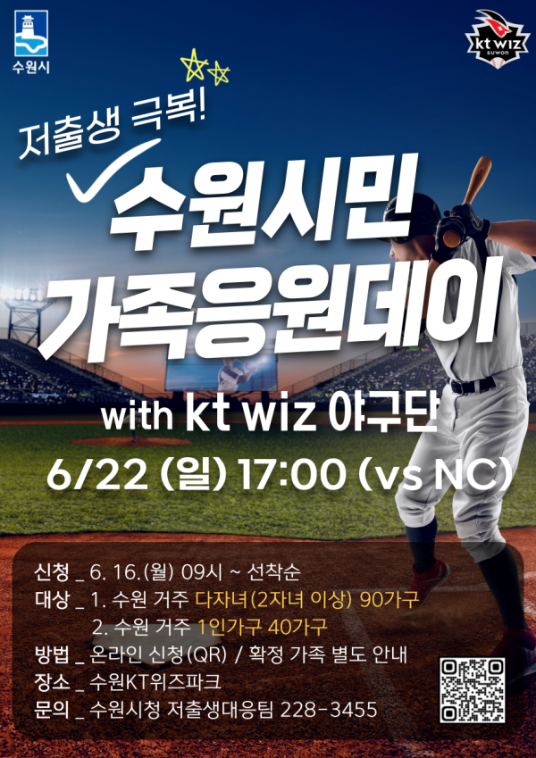 kt위즈와 함께하는 가족응원데이에는 수원에 거주하는 2자녀 이상 90가구와 1인 가구 40가구를 초청해 6월 22일 오후 5시에 열리는 kt위즈와 NC다이노스의 경기 관람 기회를 제공한다.