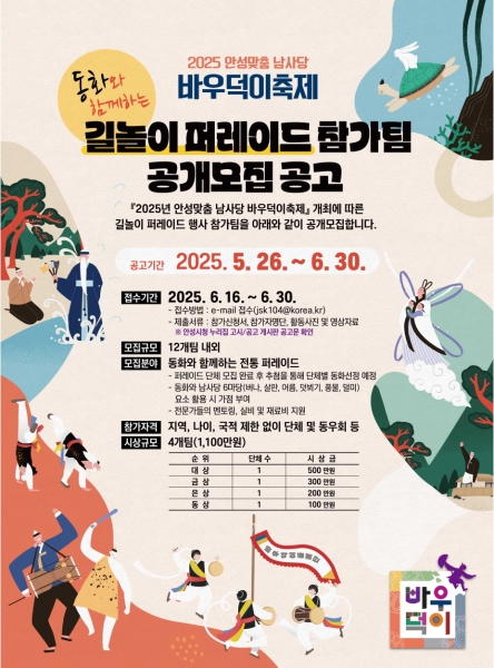 안성시 관계자는 “퍼레이드를 더욱 빛내줄 역량 있는 공연팀의 많은 관심과 적극적인 참여를 기대한다”며 “2025년 안성맞춤 남사당 바우덕이축제 길놀이 퍼레이드에서 참가팀과 관람객 모두가 하나 되어 즐길 수 있는 행사가 될 수 있도록 최선을 다해 준비하겠다”고 전했다.