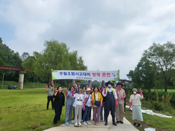 구는 연수교에서 탱크로리 차량 전복으로 경유 500L가 유출되어 하천으로 유입되고 물고기가 폐사하는 등의 재난 상황을 가상해 모의훈련을 진행했다.