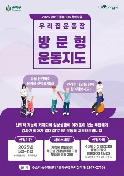 [금요저널] 송파구는 고령화와 1인 가구 증가 등으로 발생하는 돌봄 공백을 해소하고자 방문형 운동지도 서비스인 ‘우리집 운동장’ 사업을 신설하고 돌봄 SOS 서비스를 확대 운영한다고 밝혔다.