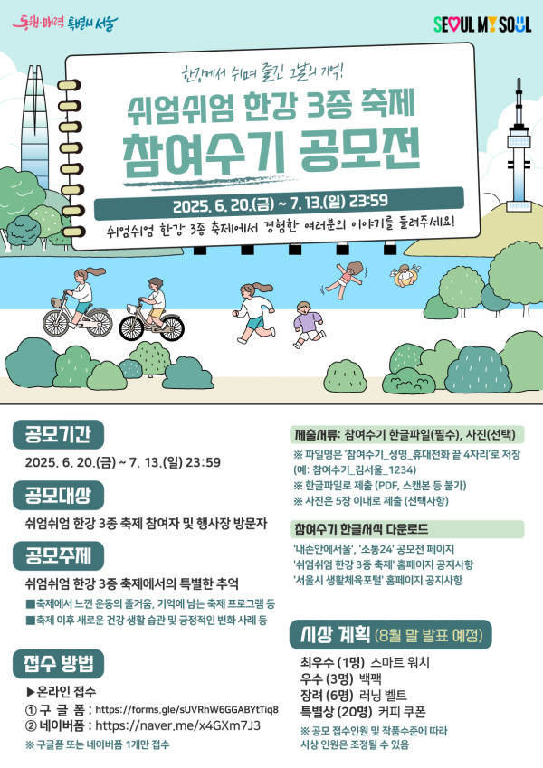 공모주제는 ‘쉬엄쉬엄 한강 3종 축제에서의 특별한 경험’ 이며 축제에서 느낀 운동의 즐거움, 기억에 남는 프로그램, 축제를 계기로 만든 새로운 건강생활습관, 축제로 인한 긍정적인 변화 사례 등 자신만의 경험담을 자유롭게 작성하면 된다.