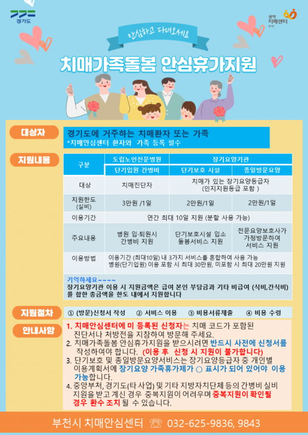 ‘치매가족돌봄 안심휴가지원’은 경기도 전역에서 시행 중인 치매가족 지원정책의 일환으로 부천시치매안심센터가 주관해 운영하고 있다.