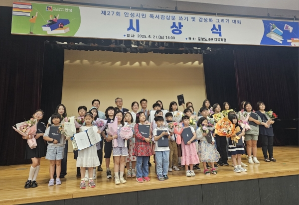 [금요저널] 안성시는 6월 21일 중앙도서관 다목적홀에서 ‘제27회 안성시민 독서감상문 쓰기 및 감상화 그리기 대회’ 입상자를 대상으로 시상식을 열고 시민의 독서문화 확산에 기여한 수상자에게 상을 전달했다.