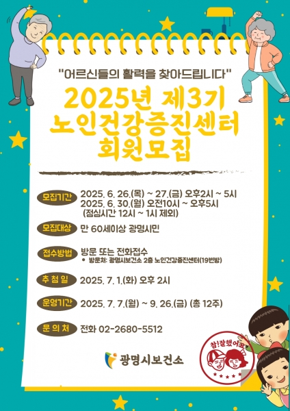 [금요저널] 광명시보건소 노인건강증진센터는 60세 이상 관내 어르신을 대상으로 2025년도 제3기 신규 회원을 모집한다.