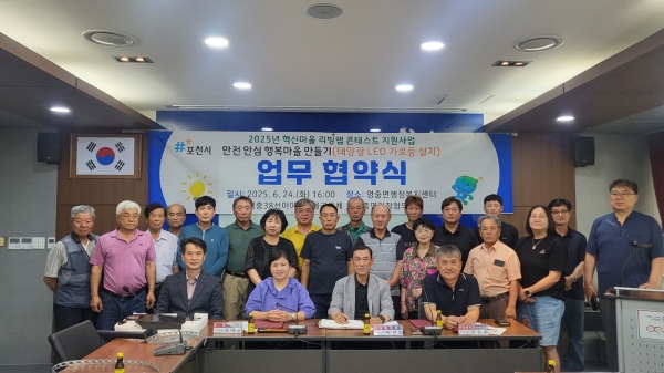 [금요저널] 영중38선이야기마을공동체는 지난 24일 포천시 영중면 행정복지센터에서 영중면 이장협의회와 마을 내 태양광 엘이디 가로등 설치를 위한 업무협약을 체결했다.