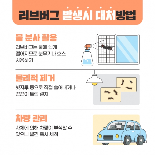 벽면에 붙은 러브버그는 분무기나 호스를 이용한 물 분사가 효과적이며 차량에 붙은 사체는 산성 성분으로 차량 도장면 손상을 유발할 수 있어 즉시 세차하는 것이 필요하다.