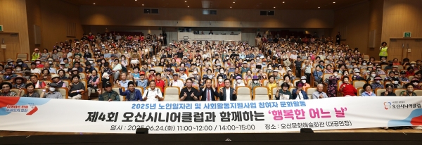 [금요저널] 오산시는 노인일자리지원기관인 오산시니어클럽과 함께 지난 6월 24일 오산문화예술회관 대공연장에서 ‘2025년 노인 일자리 및 사회활동 지원사업’ 참여 어르신 1,300여명을 대상으로 문화 활동 프로그램을 실시했다고 밝혔다.