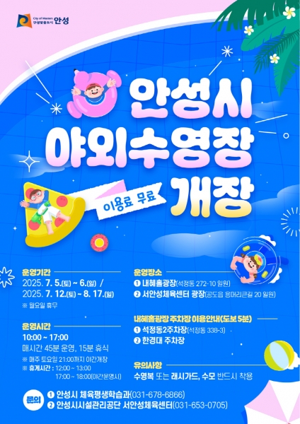 안성시 관계자는 “올해는 운영 장소를 분산하고 야간 개장을 도입함으로써 시민 편의성이 한층 향상될 것으로 기대된다”며 “시민들이 안전하고 시원한 여름을 보낼 수 있도록 수영장 운영에 철저를 기하겠다”고 밝혔다.