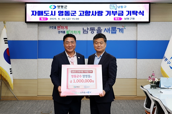 [금요저널] 인천시 남동구는 자매결연도시인 충북 영동군에서 남동구를 방문해 고향사랑 기부금을 기탁했다고 27일 밝혔다.