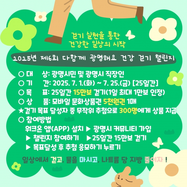 [금요저널] 광명시는 시민의 건강한 생활습관 형성과 만성질환 예방을 위해 7월 1일부터 25일까지 ‘2025년 제6회 다함께 광명해요 건강 걷기 챌린지’를 운영한다.
