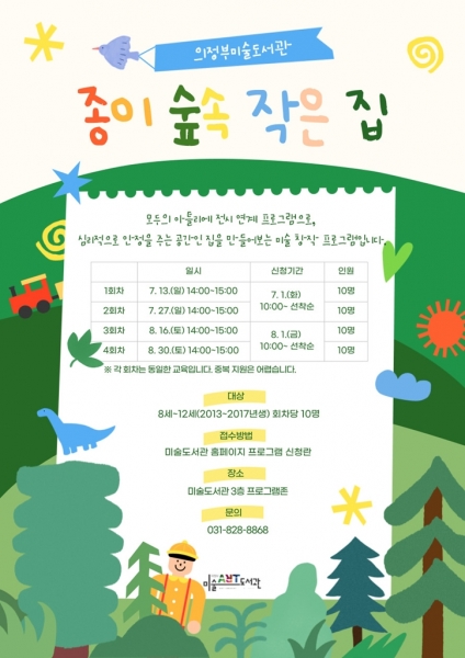 [금요저널] 의정부미술도서관은 7월부터 8월까지 어린이 대상 전시 연계 프로그램 ‘종이 숲속 작은 집’을 운영한다.