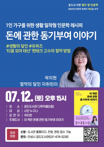 [금요저널] 안성시 공도도서관은 오는 7월 12일 오후 3시, 공도도서관 3층 다목적홀에서 마중하는 열두 달 인문학 프로그램 ‘1인 가구를 위한 돈에 관한 동기부여 이야기’를 운영한다.