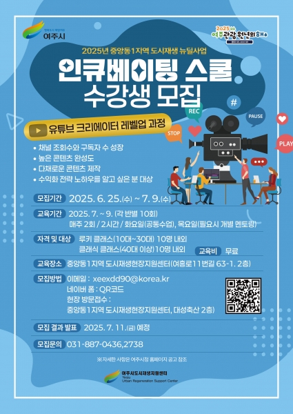 [금요저널] 여주시는 중앙동1지역 도시재생 뉴딜사업으로 추진되는 ‘인큐베이팅 스쿨 - 유튜브 크리에이터 레벨업 과정’의 수강생을 모집한다고 밝혔다.