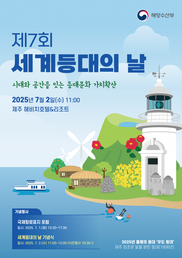 [금요저널] 해양수산부는 7월 2일 11시 해양수산부 올해의 등대로 선정된 ‘우도등대’ 가 위치한 제주에서 ’ 시대와 공간을 잇는 등대문화 가치확산’을 주제로 ‘제7회 세계등대의 날’ 기념식을 개최한다고 밝혔다.