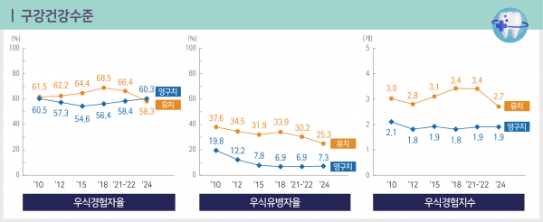 치과병·의원에서 칫솔질 및 구강관리용품 사용법 등 구강보건 교육 경험이 있는 아동은 43.8%로 개선되었으나 낮은 수준이며 구강건강관리 문제로 발생할 수 있는 잇몸 통증 및 출혈 경험률은 39.8%로 2021-22년 대비 증가했다.