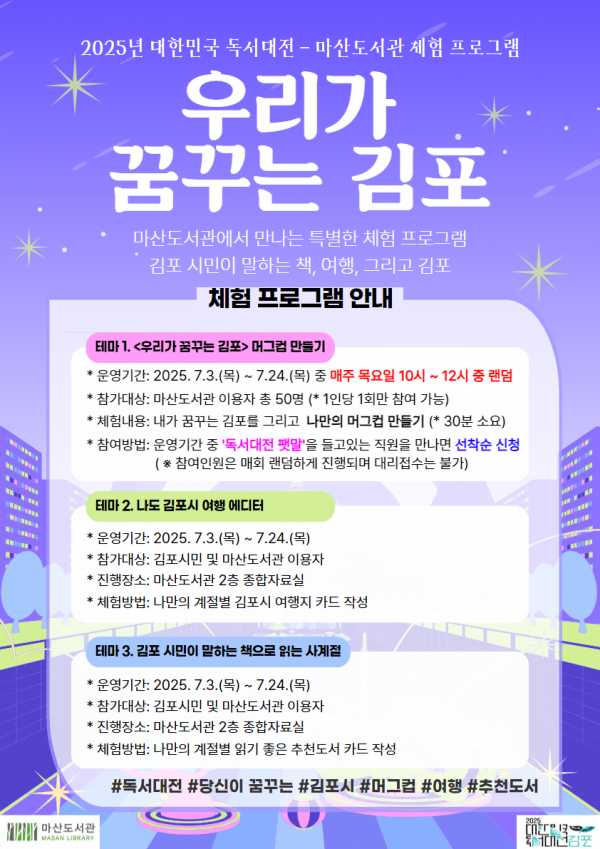 [금요저널] 김포시 마산도서관은 2025년 대한민국 독서대전 개최를 기념해 7월 3일부터 7월 24일까지 ‘우리가 꿈꾸는 김포’라는 체험 프로그램을 운영한다.