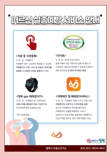 한편 실종 예방 서비스 신청 및 치매 관련 상담은 평택시 안중보건지소나 가까운 치매안심센터, 치매 상담 콜센터로 문의하면 된다.
