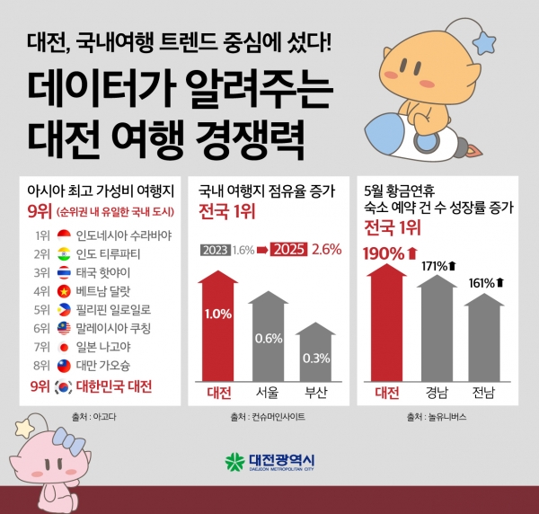 [금요저널] 대전시가 글로벌 여행 플랫폼 아고다가 발표한 ‘2025 아시아 최고 가성비 여행지' 순위에서 국내 도시 중 유일하게 이름을 올리며 명실상부한 관광도시로서의 위상을 입증했다.