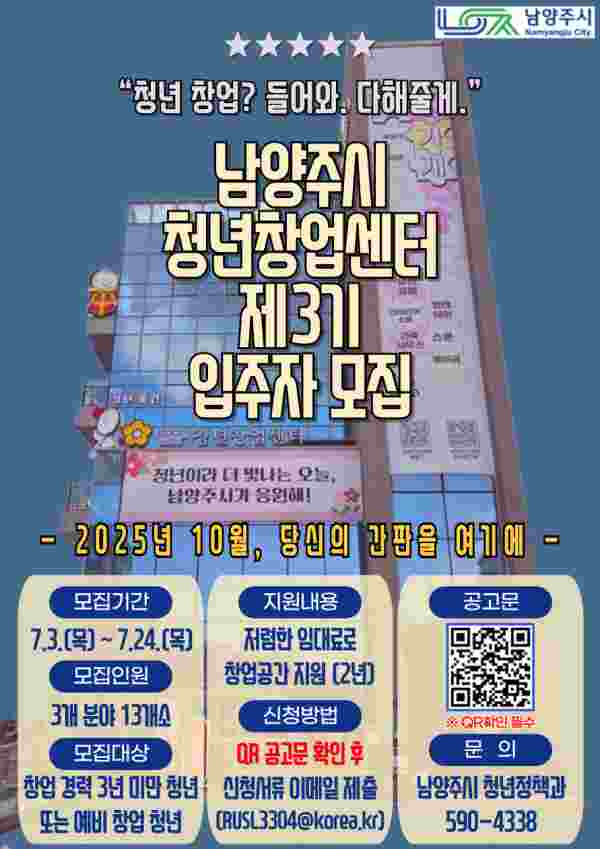 [금요저널] 남양주시는 청년 창업가들이 마음껏 창업에 도전할 수 있도록 제3기 청년창업센터 입주자를 이달 3일부터 모집한다고 4일 밝혔다.
