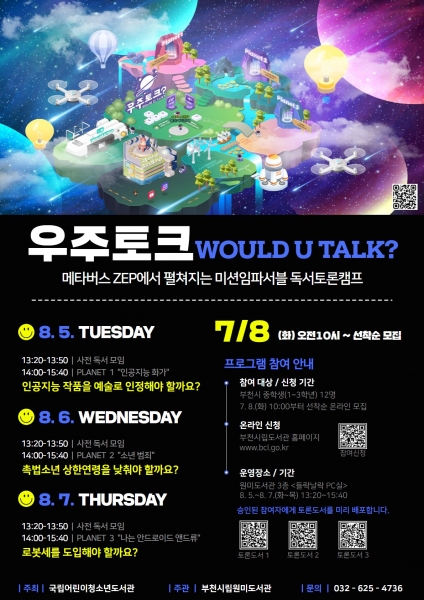 참가자들은 ‘인공지능 쫌 아는 10대’ 등 무상으로 제공된 책 3권을 읽고 ‘인공지능의 창작활동’, ‘소년 범죄’, ‘로봇세’를 주제로 메타버스 플랫폼 ‘우주 토크’를 활용해 토론에 참여한다.