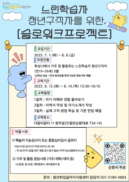 지원 자격은 화성시에서 거주 및 활동하는 느린학습자 청년 구직자로 총 5명을 모집한다.