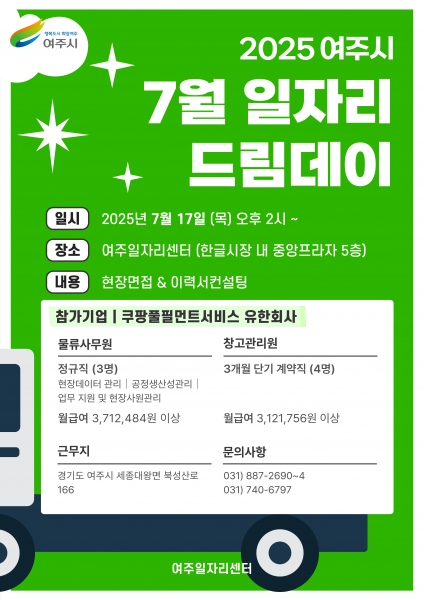 [금요저널] 여주시는 오는 7월 17일 오후 2시 여주일자리센터에서 ‘2025년 7월 일자리드림데이’를 연다 일자리드림데이는 취업을 희망하는 시민과 인재를 찾는 기업을 직접 연결하는 소규모 채용 만남의 장으로 구직자 누구나 부담 없이 참여할 수 있도록 접근성과 현장성을 강화하기 위해 여주일자리센터에서 매월 꾸준히 운영한다.