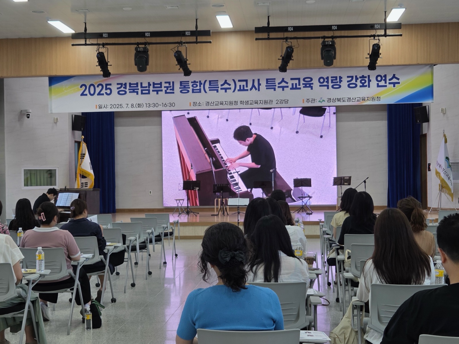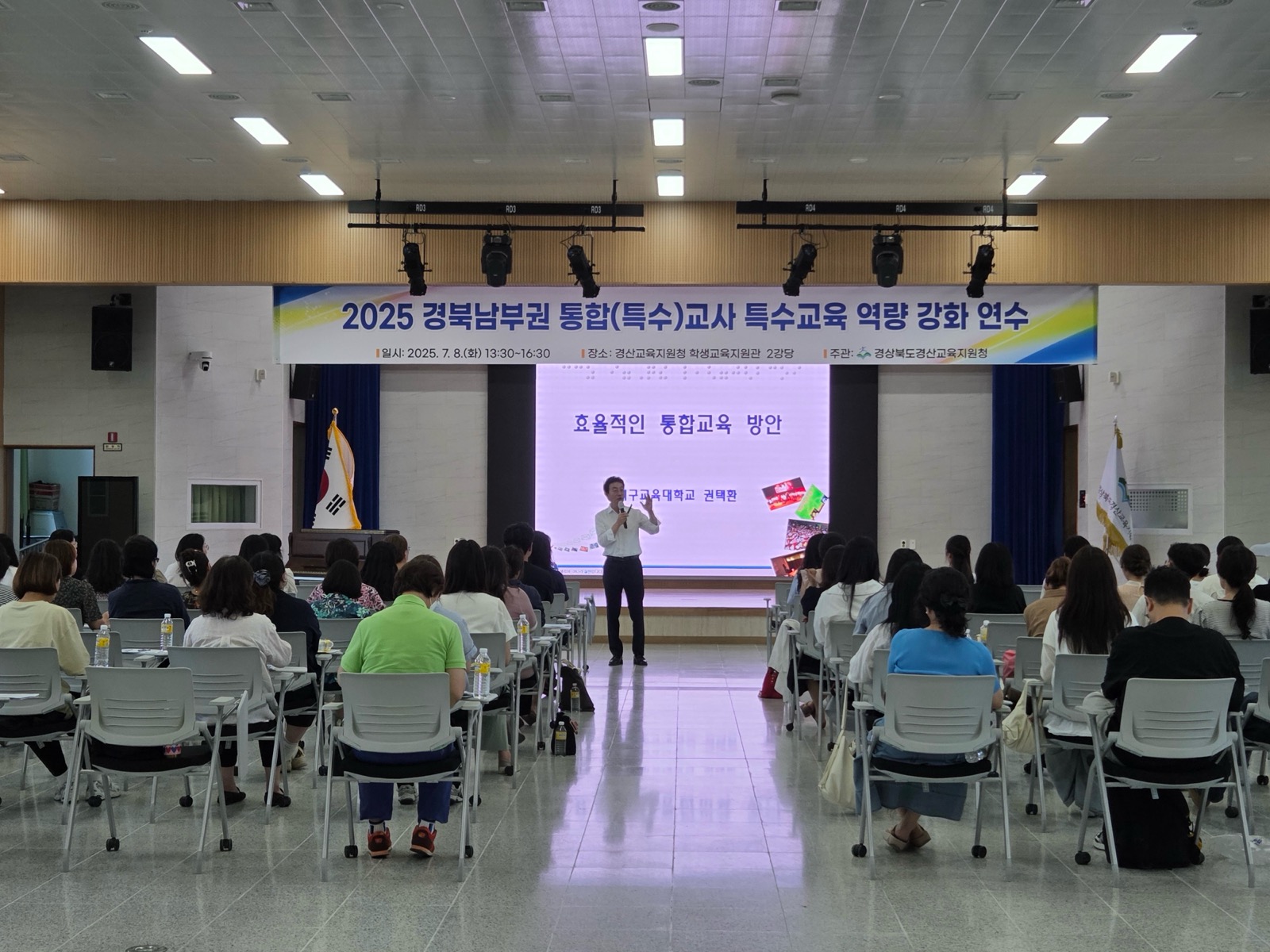 □ 경산교육지원청(교육장 박경화)은 7월 8일 본관 1강당에서 경북 남부권(경산, 영천, 청도, 경주) 유, 초, 중, 고등학교 통합(특수)교사를 대상으로 특수교육 역량 강화 연수를 개최하였다.